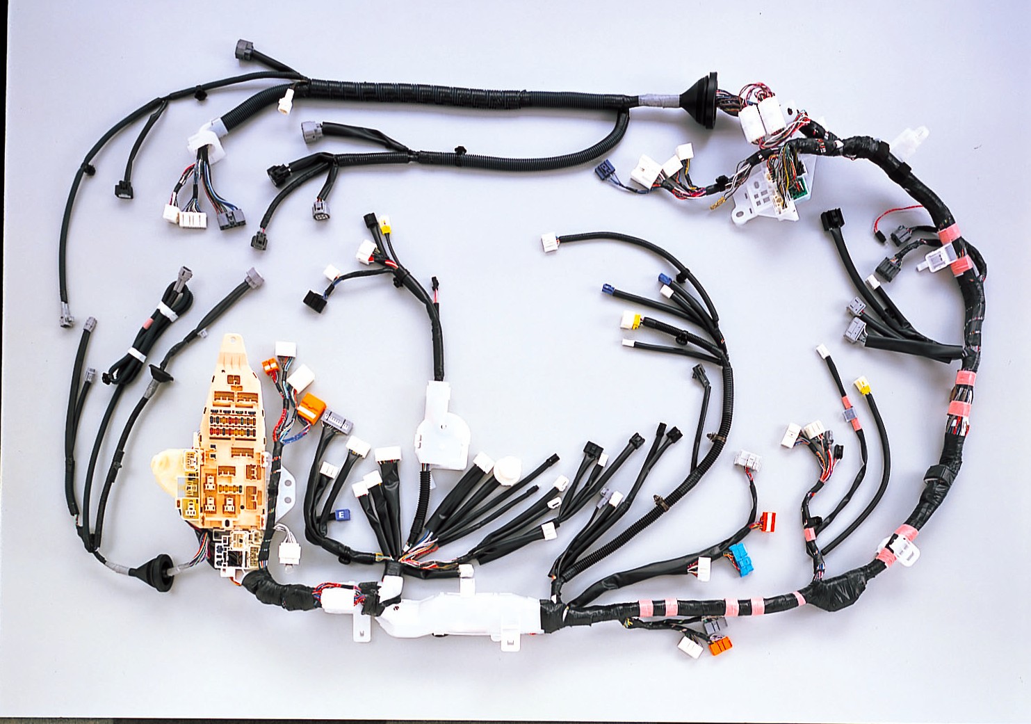 コネクタ、電線、テープ、クリップ、チューブ、シート、ヒューズBOX等々の数多くの部品で構成されます。非常に複雑な構造になっており、車種やグレードごとによって品番が異なります。エンジンの始動、各種モータ駆動、各種スイッチ情報、CAN通信等々、電源や通信情報がワイヤーハーネスを介して、自動車の中に拡がります。