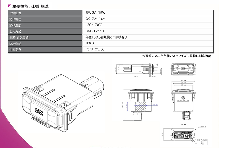 防水/非防水仕様が選択でき、イルミネーションやデータ拡張機能も追加可能なUSBチャージャ