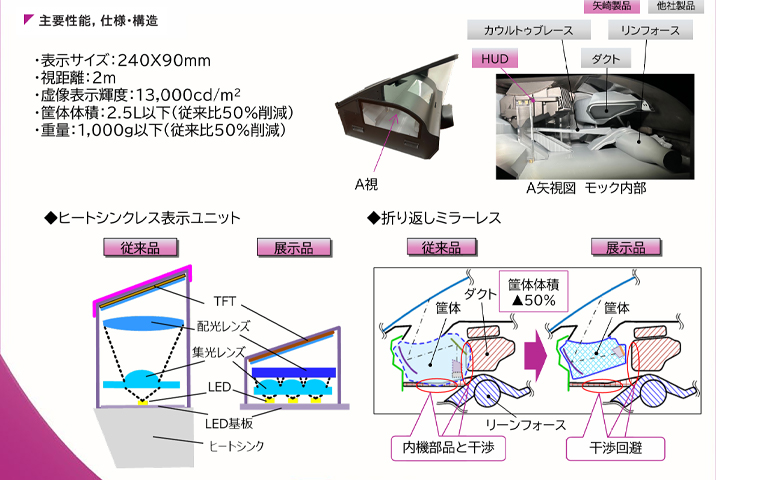 表示サイズは従来品と同等でありながら、小型車両への搭載を可能にする小型筐体HUD