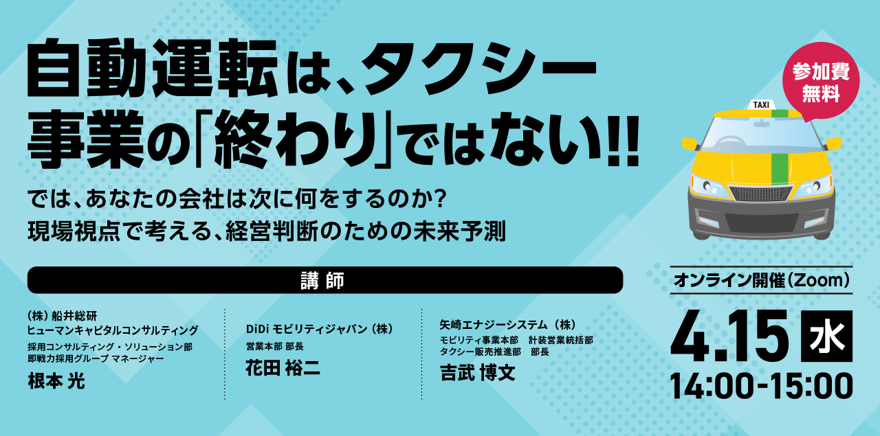 「自動運転時代はタクシーの終わりなのか?」本セミナーでは、その問いに真正面から向き合い、タクシーがこれからも社会に必要とされ続ける理由を紐解きます。