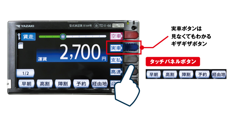 タッチパネルボタンは感圧方式に比べて10倍高耐久。1画面に最大5個表示可能です。