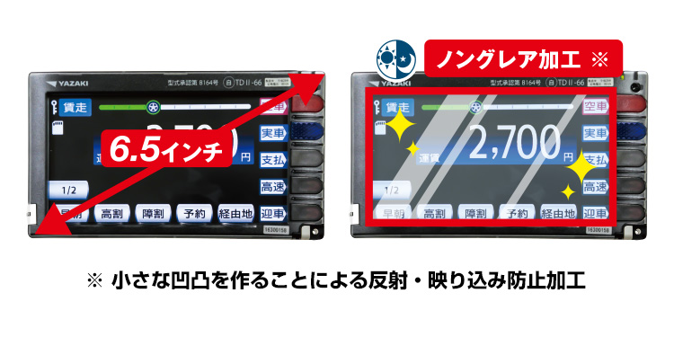 6.5インチの大画面と、ノングレア加工で昼夜どちらも画面がはっきりと見えます。